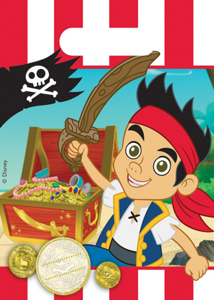 • Desenho animado de pirata infantil com baú do tesouro e bandeira pirata
