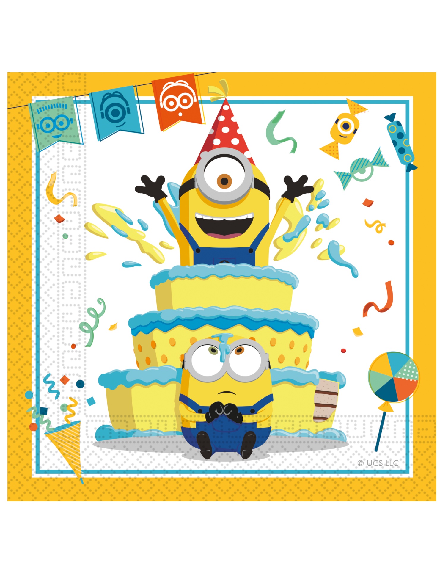 • Guardanapo amarelo com Minions em festa e bolo azul e amarelo