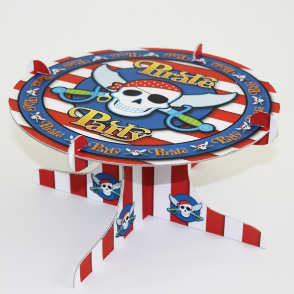 • Mesa de papelão redonda com tema pirata e riscas vermelhas e brancas.