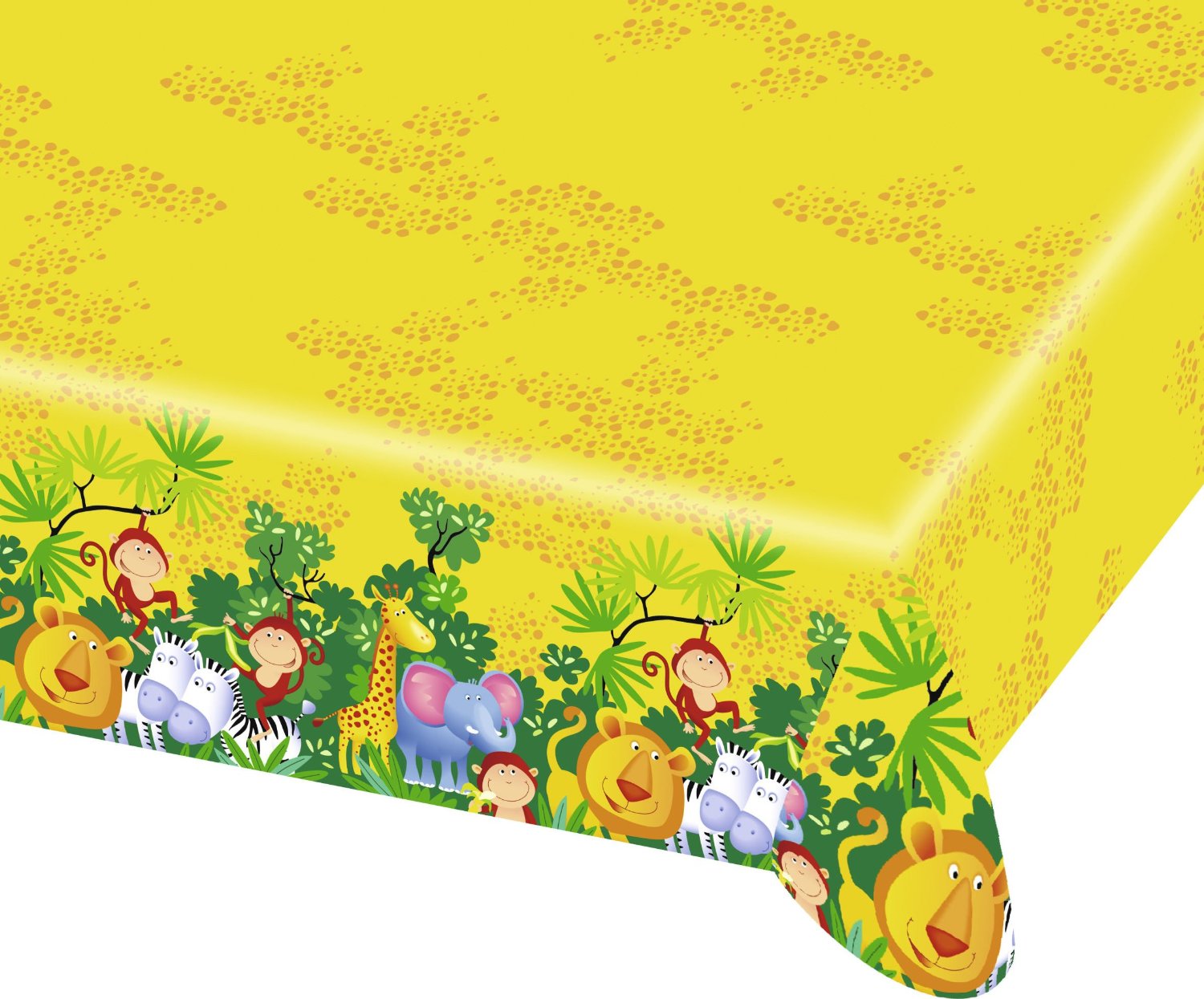 • toalha de mesa amarela com animais da selva coloridos na borda