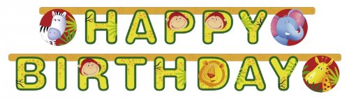 • Faixa decorativa de aniversário com letras verdes e desenhos de vários animais