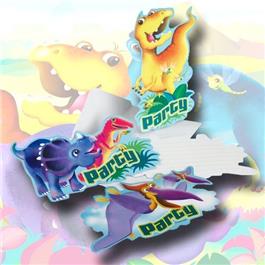 • Três adornos de festa com dinossauros e a palavra PARTY