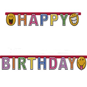 • Faixas decorativas coloridas com texto HAPPY BIRTHDAY e emojis sorridentes