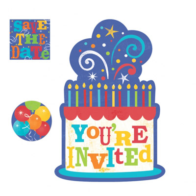 • Cartão festa formato bolo com velas e texto YOU'RE INVITED, selo SAY THE DATE e balões coloridos