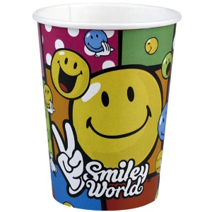 Copo de papel colorido com carinhas sorridentes e texto Smiley World