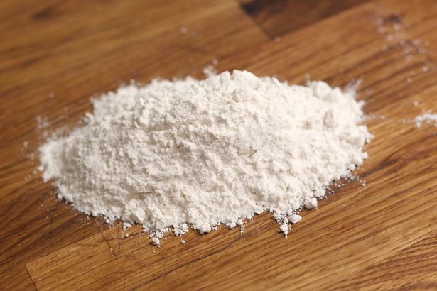 Montinho de farinha branca sobre madeira