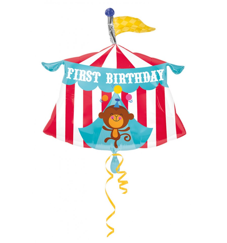 Balão tenda de circo vermelho e branco com texto FIRST BIRTHDAY e desenho de macaco de festa