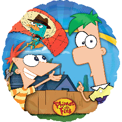 Dois personagens animados e pára-quedas colorido com texto Phineas and Ferb