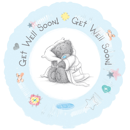 • Balão redondo azul claro com ursinho e texto Get Well Soon
