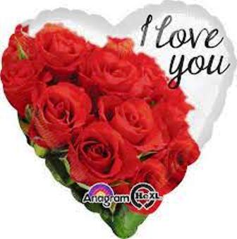 • Balão em forma de coração com rosas vermelhas e texto I Love You