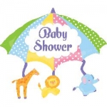 Balão metálico colorido com 'Baby Shower' e figuras de animais