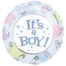 Balão metalizado com texto 'It's a BOY!' e desenhos infantis coloridos
