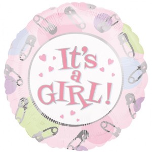 • Balão redondo colorido com texto 'It's a GIRL!' e alfinetes de segurança desenhados