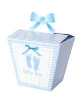 • Caixa de presente azul e branca com laços e texto Baby Boy