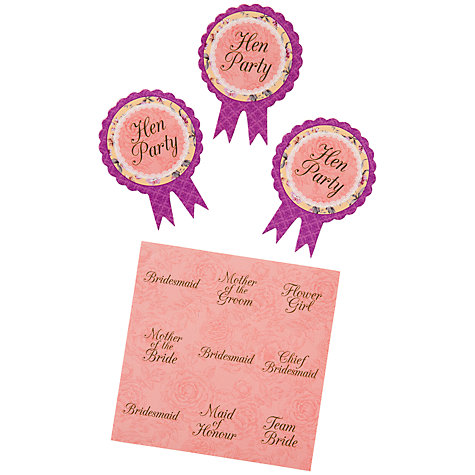 • Três rosetas e folha de autocolantes para festa Hen Party em rosa e roxo.