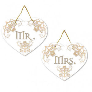• Dois painéis de coração decorativos com texto MR. e MRS. e detalhes dourados.