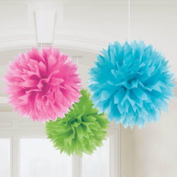 • Pompons decorativos de papel em rosa, azul e verde pendurados no teto