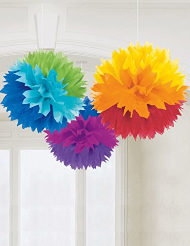• Três pompons coloridos de papel pendurados no teto