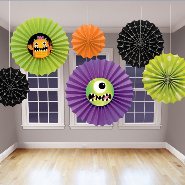 • Decorações penduradas de papel colorido com faces de monstros em divisão interior