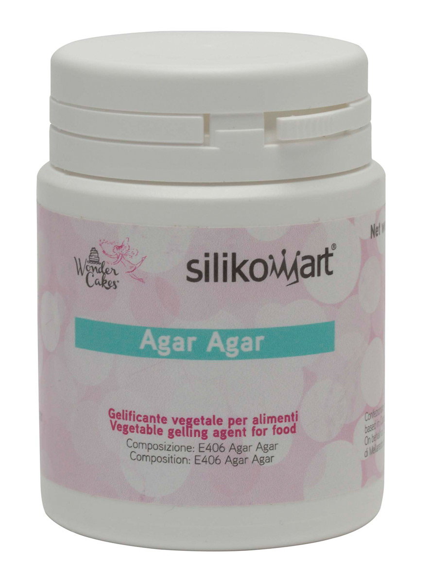 • Frasco branco de Agar Agar da silikomart com rótulo rosa claro e texto em italiano e inglês.