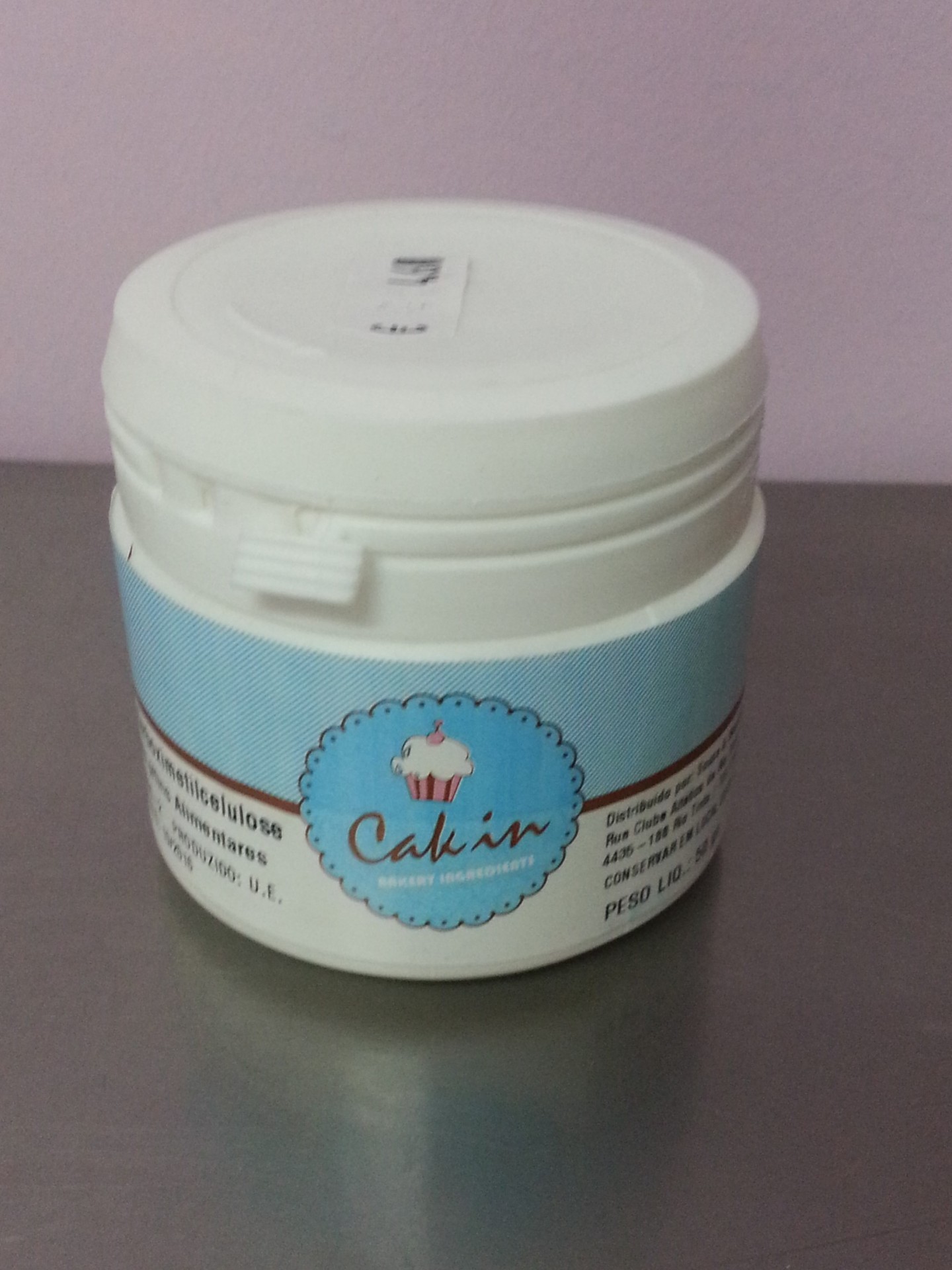 • Frasco branco com rótulo azul e desenho de cupcake