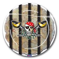 Disco de frisbee com caveira de pirata e riscas pretas.