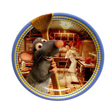 • Placa redonda decorativa com personagem animado de rato numa cozinha profissional