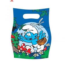 • Sacola azul com desenho de um Smurf entre cogumelos e flores