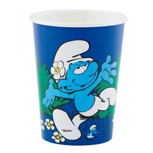 • Copo azul com desenho do personagem Smurf e flores brancas.
