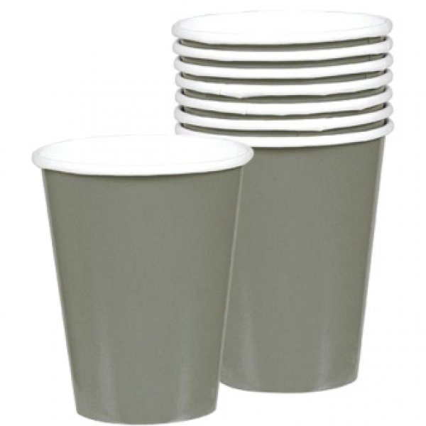 • Copos descartáveis de papel cinza com interior branco empilhados