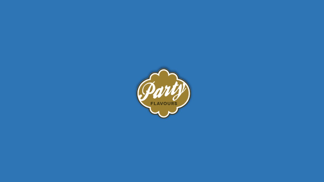 Etiqueta dourada com texto 'Party FLAVOURS' sobre fundo azul.