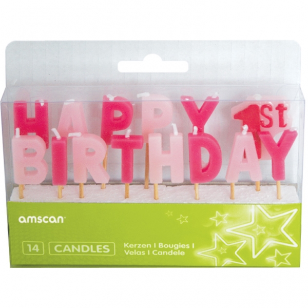 Velas decorativas em caixa com frase HAPPY 1st BIRTHDAY em rosa e vermelho