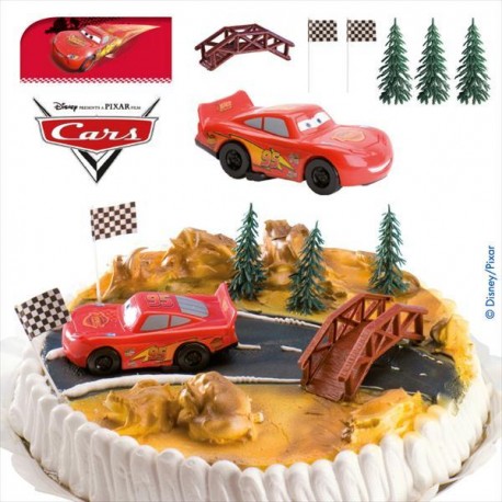 • Bolo decorado com carros de brinquedo, árvores, bandeiras e ponte com temática do filme Cars