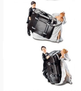 • Figuras de bolo noivo e noiva segurando mala preta