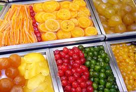 • Bandejas metálicas com frutas em calda coloridas organizadas para venda