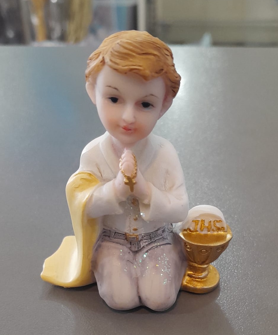 • Figura de criança ajoelhada com roupa branca e amarela e cálice dourado
