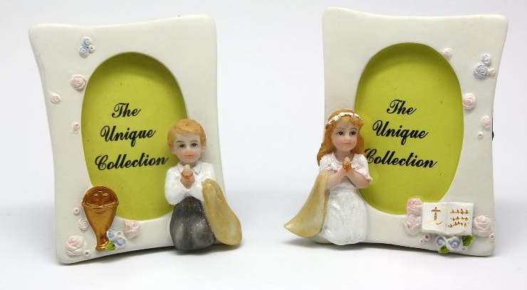 • Dois porta-retratos cerâmicos com figuras de crianças ajoelhadas, texto The Unique Collection no centro em fundo verde