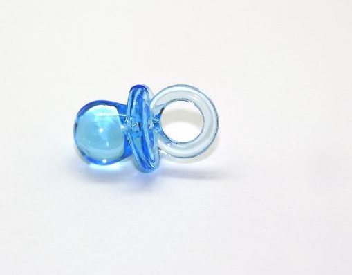 • Chupeta de plástico azul translúcido com bocal circular e botão arredondado
