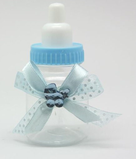 • Frasco em plástico transparente com tampa azul e laço decorativo azul claro