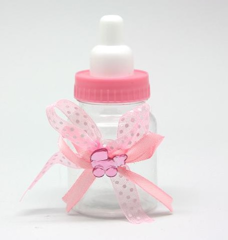 • Frasco em forma de mamadeira com tampa rosa e decoração em fita rosa e ursinho
