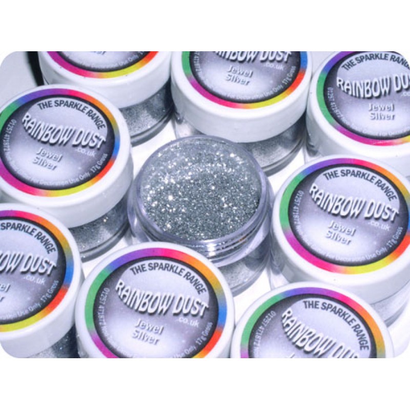• Frascos de pó brilhante prata com tampas brancas e etiquetas coloridas com texto Rainbow Dust