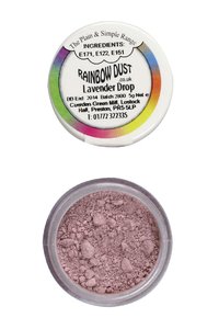 • Frasco pequeno de pigmento em pó cor Lavender Drop da Rainbow Dust com tampa branca e informações impressas