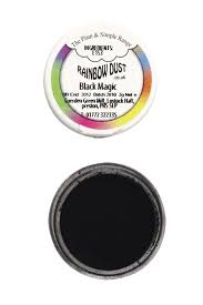 • Recipiente redondo aberto com pó preto e rótulo colorido Rainbow Dust Black Magic