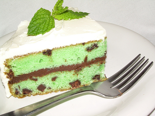 • Fatia de bolo verde com chocolate e cobertura branca no prato com garfo