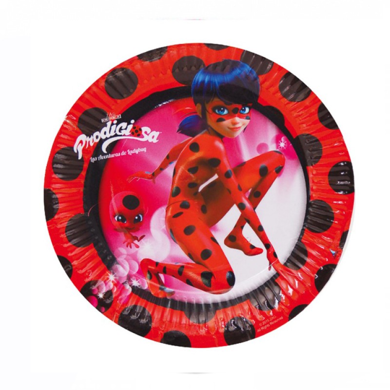 • Prato de papel vermelho com pontos pretos e personagem de desenho animado