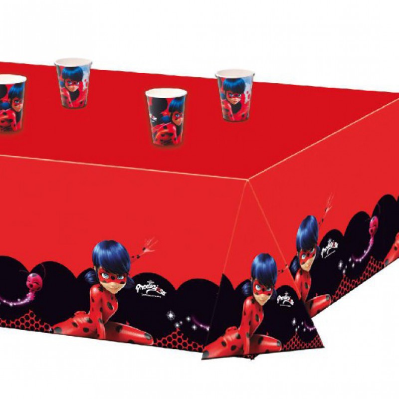 • Decoração de festa Ladybug com toalha vermelha e copos descartáveis com personagem Ladybug
