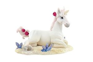 • Pelúcia de unicórnio branco com flores cor-de-rosa sobre base de areia com pedras azuis