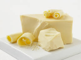 • Bloco grande de manteiga amarela com rodelas enroladas de manteiga em superfície branca