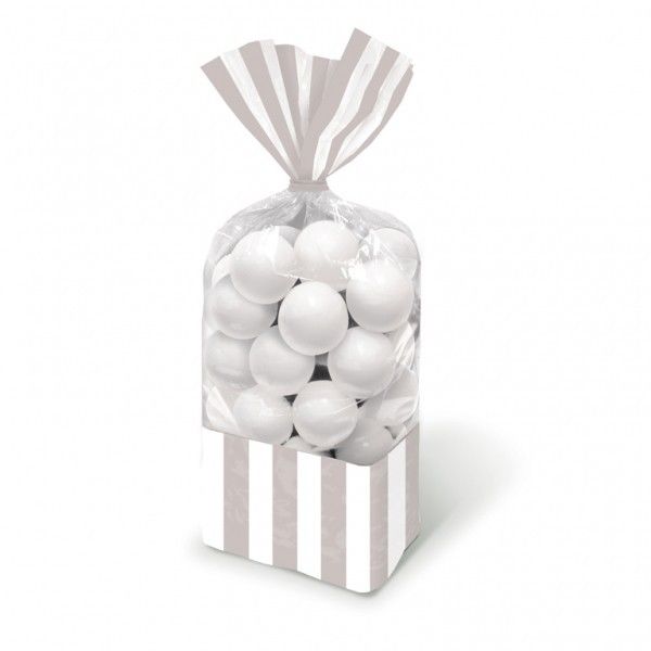 Embalagem transparente com bolas brancas e riscas cinza e branco