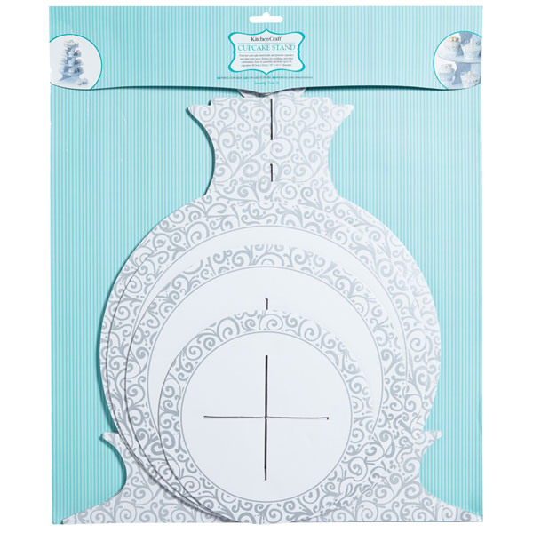 • Suporte para cupcakes branco com padrão cinzento e embalagem azul